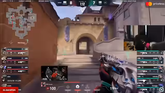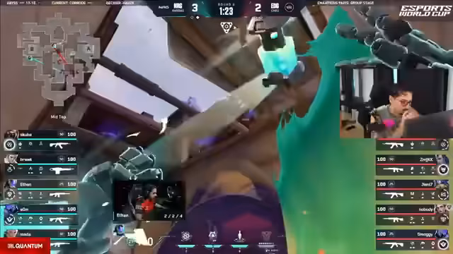 01:54:15Ein explosives Spielmoment wird beschrieben, als ein Spieler 'Ace' erzielt - eine Serie von eliminierten Gegnern in kurzer Zeit. Das gefährliche Spielverhalten der Teams zeigt sich bei einem Versuch von NRG, eine Position durch einen Smoke zu nehmen. Der Streamer lobtSmarty für seine Nähe zu einem Spielexecution. Mata wird für seine bemerkenswerten Frag-Erfolge in der zweiten Halbzeit hervorgehoben.