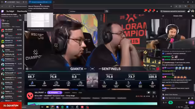 02:35:29Es wurde über das laufende VCT Champions Turnier in Paris diskutiert. Aktuell läuft das Spiel gegen Xing-Sao-Gaming in League of Legends. Es wurde die Notwendigkeit betont, zwei Spiele zu gewinnen, um im Turnier voranzukommen. Ein Ausblick auf mögliche zukünftige Begegnungen wurde gegeben, darunter Paper Rex gegen Giants, wobei Paper Rex als Favorit gehandelt wird. Spekulationen über ein mögliches Spiel zwischen Sentinels und Paper Rex wurden ebenfalls angestellt. Zudem wurde das Match zwischen Chad Morgan und Energy/EBG, den letztjährigen Champions-Winnern, sowie GRX gegen Liquid erwähnt. Aufgrund eines eigenen Termins um 18 Uhr kann nicht jedes Spiel live verfolgt werden, wobei ein früherer Start der Spiele bei schnellen 2-0 Ergebnissen möglich ist. Abschließend wurde erklärt, dass das Turnier wie eine Weltmeisterschaft im Valorant zu betrachten ist, bei der Teams in der Gruppenphase um den Einzug in die Playoffs kämpfen.