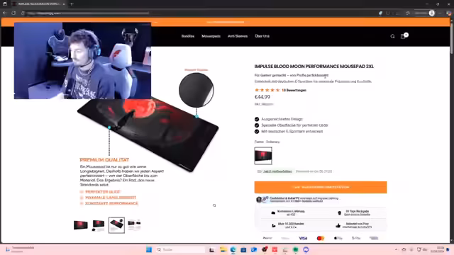 00:15:39Nachdem der Shop erfolgreich online gegangen ist, präsentiert der Streamer die angebotenen Produkte. Begehrte Designs wie Blood Moon und Sakura sind zurück, darunter auch völlig neue Artikel wie der Blood Moon Sleeve, der es noch nie zu kaufen gab. Zusätzlich bietet das Unternehmen zwei neue, cleanere Blank-Designs an. Er hebt die hohe Qualität der Mausmatten und Armsleeves hervor, die eine Premium-Oberflächenbeschichtung haben, die nicht so schnell abgenutzt wird. Er betont, dass er die Produkte persönlich getestet hat und darauf besteht, dass sie die beste Performance auf dem Markt bieten.