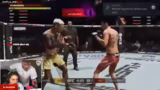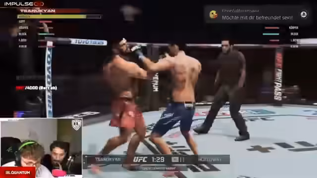05:23:07Das erste Duell im UFC-Spiel beginnt und wird von beiden Beteiligten mit großer Intensität geführt. Es kommt zu schnellen Tausch von Schlägen und Kicks. Der Streamer fungiert als Coach für Dominik und gibt laute Ratschläge zur Deckung, zur Notwendigkeit, die Reichweite zu nutzen und Angriffe auf unterschiedliche Körperregionen zu variieren, um dem Gegner keine Angriffsmuster verraten. Trotz der Anleitung verliert die Runde und es steht 1:0.