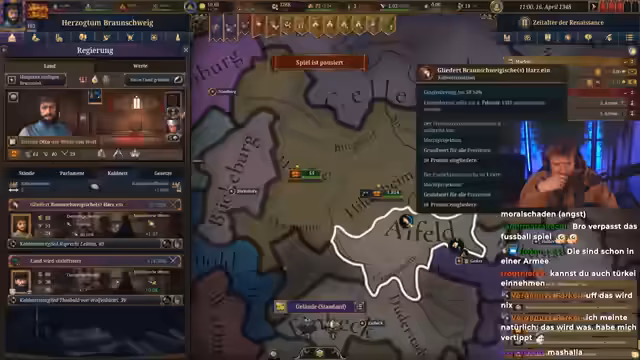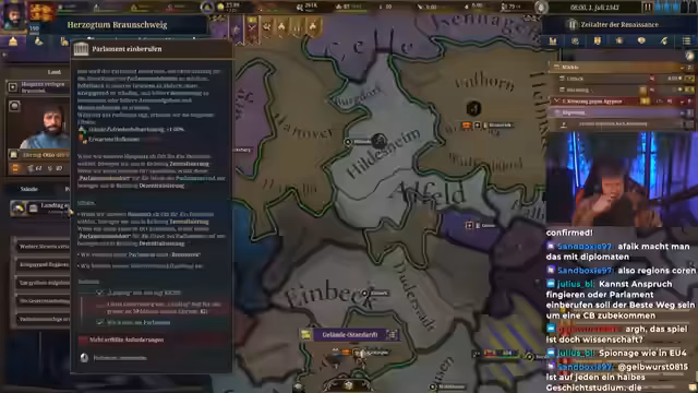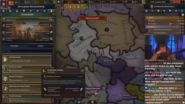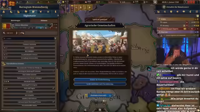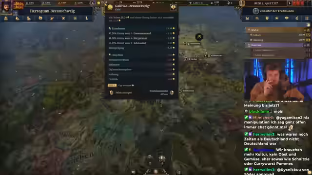 01:35:25Der Streamer bemerkt das Zeitalter der Renaissance und die damit verbundenen Veränderungen. Er hat etwas Neues erforscht und entscheidet sich für die Forschung von Nahrungsankaufkosten. Er freut sich über zehn Prestige und zehn Klerus-Stärke durch einen Vorschlag des Kirchenstaates. Er bemerkt, dass die Diplomatenkapazität gesunken ist und er sie erhöhen muss, während er gleichzeitig die Stabilität aufrechterhält. Er stellt fest, dass die Stände, insbesondere der Klerus, Gebäude wie die Eremitage und die Spinnerzunft fordern. Er kann sich diese Gebäude derzeit nicht leisten, überlegt aber, was sie bringen würden. Er vermisst Missionen und Aufgaben, die in früheren Europa Universalis-Spielen vorhanden waren. Er empfindet das Spiel als schwierig, aber unterhaltsam, obwohl er mit Braunschweig ein langweiliges Land gewählt hat. Er bemerkt, dass Frankreich im Krieg ist und seine Belagerungsfortschritte macht. Er hat noch keine Errungenschaften erzielt und stellt fest, dass es immer mehr Rebellenbewegungen gibt. Er überlegt, die Steuern des Adels zu erhöhen, aber dies ist nicht möglich. Er entdeckt, dass er Münzen prägen kann, ohne Inflation zu verursachen, was er als Fehler in seiner bisherigen Spielweise erkennt. Er plant, einen Waffenschmied zu bauen, um Truppen rekrutieren zu können, da er derzeit keine Manpower hat. Er muss entscheiden, ob er die Spinnerzunft bauen oder sich auf militärische Gebäude konzentrieren soll. Er ist besorgt über eine Krankheit, die seine Diplomatie-Kapazität senkt, und überlegt, ob das Spionagenetzwerk bestehen bleibt, wenn er den Diplomaten zurückruft. Er stellt fest, dass er Hildesheim angreifen könnte, da sie keine Truppen haben, aber die Kriegserklärung wäre zu teuer. Er forscht an monatlicher Armeetradition, um seine Militärstärke zu erhöhen. Er nimmt die Stabilität aus der agrarischen Gemeinschaft und erhöht die Steuern, was jedoch zu Unzufriedenheit führt. Er bemerkt, dass die Musik im Spiel aufgehört hat und erhöht die Lautstärke. Er plant, einen Waffenschmied zu bauen und vergleicht die Produktionskosten und Gewinne in verschiedenen Provinzen.