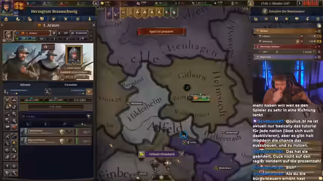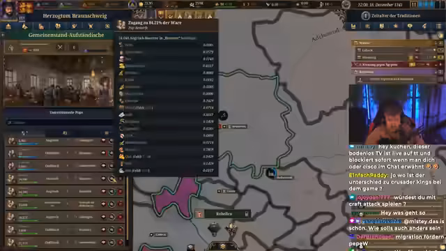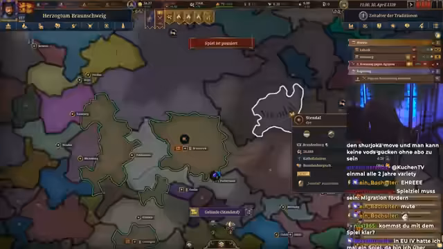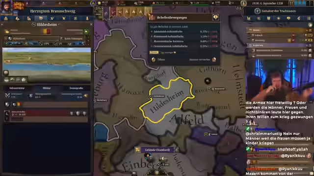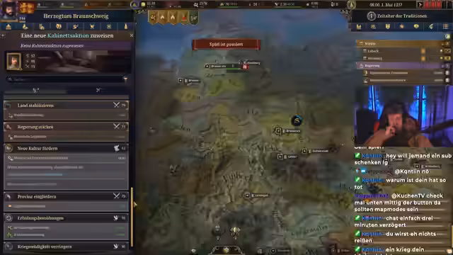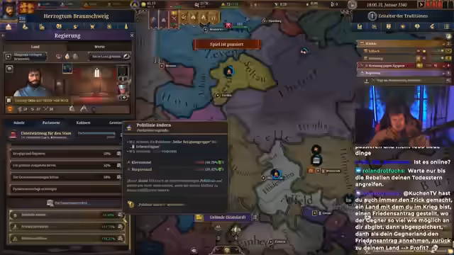 00:24:10Nach den ersten Gesetzesänderungen, die die Stabilität stark beeinträchtigt haben, konzentriert sich der Streamer auf die Außenpolitik, um Länder zu erobern. Er versucht, ein Bündnis mit Lüneburg einzugehen, wird aber abgelehnt, da Lüneburg nach Braunschweiger Land giert. Er äußert sich frustriert über die 'Geier' in diesem Land und sucht weitere Bündnispartner. Sachsen-Wittenberg ist bereit für ein Bündnis. Er beklagt die Unübersichtlichkeit der Karte und fragt die Zuschauer, ob man die Ansicht ändern kann. Weitere Versuche, Bündnisse mit Magdeburg und anderen kleinen Staaten einzugehen, scheitern, da diese ebenfalls nach Braunschweiger Land gieren oder die Stärke Braunschweigs als zu gering ansehen. Er beschließt, Hildesheim zu erobern, da es nur drei Provinzen hat und sucht dafür Verbündete. Er nimmt ein Bündnis mit Henneberg an. Er stellt fest, dass er finanzielle Probleme hat und seine Steuern erhöhen muss, um nicht pleite zu gehen. Er erhöht die Steuern für alle Stände, muss aber feststellen, dass dies nicht überall möglich ist. Er versucht, an Hofkosten und Armeeunterhalt zu sparen, obwohl er noch keine Armee hat. Er entdeckt, dass er Geld in Stabilität investieren kann, um die negative Entwicklung auszugleichen. Er versucht, die Meinung von Lüneburg zu verbessern, um einen Angriff zu verhindern. Er hat Schwierigkeiten, die Pop-Bedarfe zu verstehen und Gebäude zu bauen, da er kein Geld hat und die Kosten nicht sofort ersichtlich sind. Er ignoriert die Unzufriedenheit der Stände und die aufkommenden Probleme wie Krankheiten (Pocken, Masern), da er sich überfordert fühlt und sich auf die positiven Aspekte konzentrieren möchte. Er stellt fest, dass die Stabilität langsam steigt, was die negativen Effekte der Unzufriedenheit reduziert. Er plant, die Steuern zu senken, sobald sich die Lage stabilisiert hat, und bereitet sich auf einen möglichen Krieg vor, indem er Truppen bauen möchte.