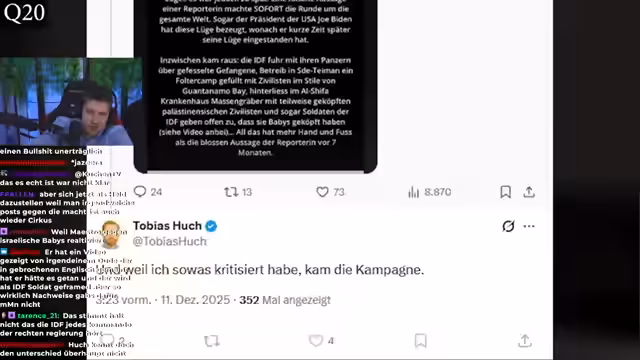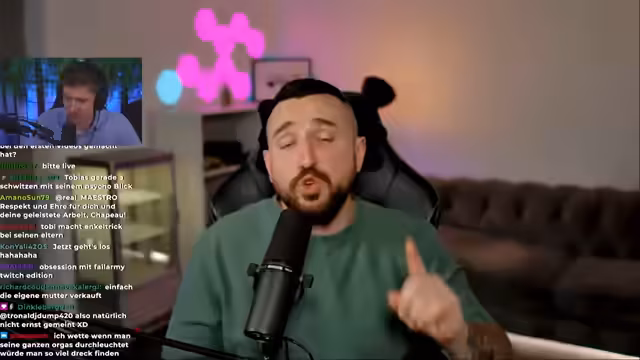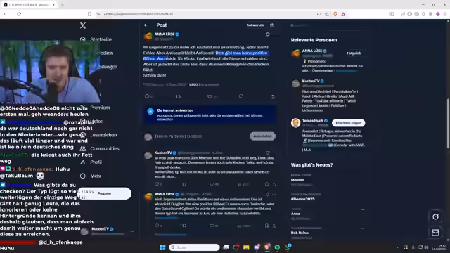 04:01:17Im Verlauf des Streams werden mehrere Lügen Huchs aufgedeckt, etwa zu vermeintlichen Verbindungen von Snitch zu den Grauen Wölfen oder zur Behauptung, Meestro habe seine Eltern beschimpft. Huch wird Narzissmus und bewusste Täuschung vorgeworfen, da er Falschaussagen nie eingesteht. Zudem wird seine Weigerung kritisiert, sich live mit Meestro zu einer Debatte zu stellen, obwohl er privat Dialoge sucht. Die anhaltenden Widersprüche und persönlichen Attacken spiegeln einen tiefen Vertrauensverlust wider.