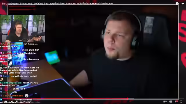00:37:57TANZVERBOT geht scharf auf KDR Kitten und vor allem Milchbaum los, die sich in den Streams kritisch zu ihm geäußert hatten. Er wirft Milchbaum vor, gelogen zu haben und sich ohne genügend Hintergrundwissen in die Situation einzumischen. Er konfrontiert sie damit, dass sie Lola und ihn kaum persönlich getroffen hat und nur auf der Seite ihrer Freundin steht. Er kritisiert ihre übergroße Fresse und behauptet, sie habe selbst Dreck am Stecken, was ihr Angriffe auf ihn unglaubwürdig mache.
