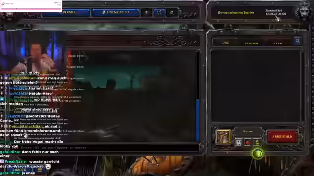02:29:14Die Streamer planen ein 3-gegen-3- oder 4-gegen-4-Match in Warcraft 3, obwohl es schwierig ist, Mitspiende zu finden. Die Suche in der Warteschlange dauert lange, und es gibt Diskussionen über alternative Spiele wie Counter-Strike oder Smash Brothers. Der Streamer äußert Frustration über die geringe Spielerzahl und schlägt vor, in bereits lobbies anderer Spieler einzusteigen oder das Spiel aufzugeben.