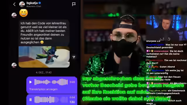 01:35:23Jakob Rätsel erläutert einen Konflikt mit Lehrenfrau, der durch gelöschte Werbe-Nachrichten in seinem Chat entstanden ist. Er betont, dass seine Mods, wie sein Chefmod Hajo, konsequent Fremdwerbung entfernen. Lehrenfrau habe ihm jedoch vorgeworfen, einen Bösenwurz-Rage-Up für das Anzeigen seines eigenen Codes in ihrem Video zu verdienen, was Jakob als Doppelmoral bezeichnet, da sie selbst Werbung unterbricht, um ihren eigenen Code zu platzieren. Er erklärt, dass er jegliche Form von Spam, einschließlich von Codes, während seiner Reactions löschen würde, und fragt, warum seine Handlungen anders bewertet werden, als wenn sie es selbst tun.