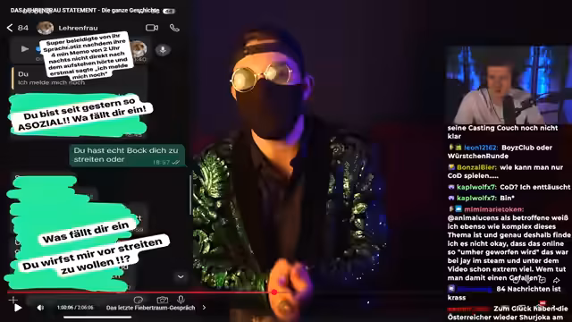 03:05:31Der Streamer gab eine persönliche Warnung an die Lehrerin, dass er gezwungen sei, Gespräche öffentlich zu machen, falls sie weiterhin Lügen über ihn verbreitet. Er betonte, dass Hörensagen in der Influencer-Szene gefährlich sei und er nur so die Wahrheit ans Licht bringen könne. Das war die direkte Reaktion darauf, dass sie nach dem privaten Streit begonnen hatte, ihn 'geisteskranke Vorwürfe' gegenüber anderen Personen zu machen, und dies würde, wenn es nicht aufhört, zu einem öffentlichen Dementier führen müssen.