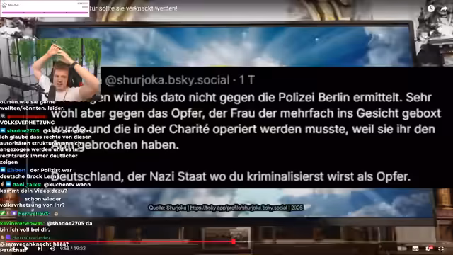 00:18:38Der Streamer analysiert Schuyokas öffentliche Äußerungen zum Berliner Vorfall genauer. Sie unterstellt in ihren Postings der gesamten deutschen Polizei systematische Gewalt und Rassismus und fordert deren Auflösung. Der Streamer kritisiert scharf ihre verallgemeinernde Sprache und ihre Weigerung, auf den konkreten Fall einzugehen. Besonders heftig wird ihr Vorwurf, Deutschland sei ein 'Nazi-Staat', zurückgewiesen, da dieser nicht belegt und grob übertrieben sei. Ihre Argumentation wird als Opfernarrativ beschrieben, das reale Vorfälle ignoriert.