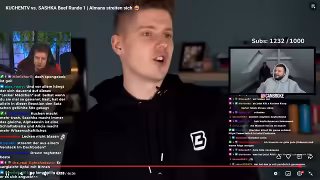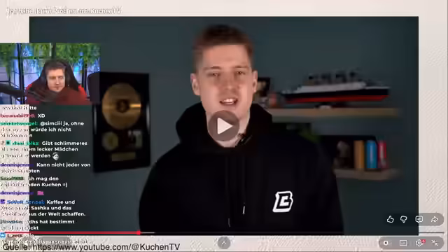 00:36:55Die eigentliche Reaktion auf Saschkas Video beginnt. KuchenTV zeigt den Clip, in dem Saschka ihm vorwirft, er würde Inhalte bewusst aus dem Kontext reißen. Er sieht darin Framing und einen gezielten Angriff auf seinen Ruf. Saschka wirft ihm zudem Arroganz und Neid vor, weil er sie mit Alicia Jo verglichen habe. Sie kritisiert, dass KuchenTV sie in fast jedem Video erwähne, was auf ein persönliches Problem hindeute. Er kontert, dass ihre Erwähnungen in seinem Format nur aufgrund von Zuschauerfragen geschehen und nicht aus persönlichem Antrieb.