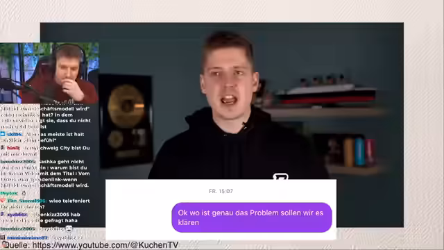 00:12:30KuchenTV adressiert Saschkas Vorwurf, er habe ihre private Nachricht ignoriert. Er stellt klar, dass sie ihm am Freitag um 15 Uhr geschrieben habe, er jedoch zu diesem Zeitpunkt mit Noah unterwegs war. Er hat ihr daraufhin angeboten, später zu telefonieren. Saschka habe sich aber nach dem Schreiben nicht wieder gemeldet, stattdessen wurde das Video zeitgleich zu geplanten News um 18 Uhr veröffentlicht. Diesen Zeitpunkt bewertet KuchenTV als unglücklich und vermutet, es sollte den Inhalt des Videos beeinflussen.
