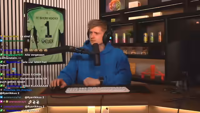 00:55:39Der Stream startet mit einem Quiz, bei dem die Teilnehmer Fragen zu Tieren beantworten müssen. Eine Frage lautet: "Welches Tier legt Eier und kann fliegen, ist aber kein Vogel?" Während Fledermaus und Fliege im Raum stehen, entscheidet sich der Streamer für die Fliege. Anschließend folgt eine Frage zum olympischen Symbol und eine weitere zum Nordpol, die klar beantwortet werden. Die Runde endet mit einer kniffligen Frage nach dem Namen von Gronkh, die Dean nicht beantworten kann und somit sein erstes Leben verliert.