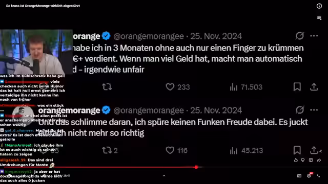 01:04:39Orange hatte einst betont, dass Geld allein nicht glücklich mache, sondern gute Freunde und eine tolle Freundin wichtiger seien. Doch diese Aussage wurde durch seine späteren Handlungen widerlegt. Er entwickelte sich zu einem Influencer, der sich fast ausschließlich über Geld und Luxus definierte. Dies zeigte sich in der demonstrativen Zurschaustellung seiner Besitztümer, wie dem vollen Preis seines ersten Autos, den er als Link in die Beschreibung packte, oder dem Flexen mit teuren Uhren auf Twitter. Kritiker sahen darin eine Kompensation und den Versuch, anderen seinen Reichtum unter die Nase zu reiben. Diese Verhaltensweisen wurden als unangenehm und als Mangel an Bodenständigkeit empfunden. Tweets wie „Wenn du mit 30 Jahren nicht mindestens 5 Millionen Euro Vermögen hast, hast du irgendwas falsch gemacht?“ oder die Angeberei mit seiner 700.000-Euro-Wohnung und dem Wunsch, „nur noch so 10.000 bis 15.000 Euro im Monat auszugeben“, verstärkten den Eindruck, dass er abgehoben sei und soziale Kontakte vernachlässige. Es wurde vermutet, dass er Komplexe entwickelt haben könnte, die ihn dazu drängten, seinen Luxus ständig zu präsentieren, um sein Selbstwertgefühl zu erhöhen.