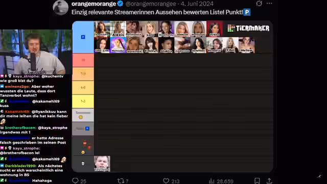 01:12:20Eine weitere drastische Wandlung zeigte sich in Oranges politischen Ansichten. Einst ein Fan von Streamern wie Papa Platte und Hand of Blood, die für vernünftige Werte standen, entwickelte er eine offensichtliche Bewunderung für Alice Weidel von der AfD und Donald Trump. Er äußerte den Wunsch, nach Deutschland zurückzuziehen, sollte Alice Weidel Bundeskanzlerin werden, und rief immer wieder dazu auf, die AfD zu wählen. Seine wiederholten Kommentare über Weidels attraktives Aussehen und Einladungen zu einem Kaffee wurden als unangenehm empfunden. Kritiker vermuteten, dass dies eine Trotzreaktion auf den Hass war, den er nach seinen Casino-Deals erhielt, und dass er bewusst provozieren wollte. Diese politischen Äußerungen, gepaart mit seiner demonstrativen Angeberei, ließen ihn als unreif und rücksichtslos erscheinen. Zudem wurde seine Scheinheiligkeit in Bezug auf andere Influencer deutlich, insbesondere im Umgang mit Tanzverbot. Er provozierte Tanzverbot jahrelang, parodierte dessen emotionale Posts und verbreitete Gerüchte, was schließlich in der Veröffentlichung von Tanzverbots Adresse gipfelte. Diese Handlungen wurden als ekelhaft und schädlich angesehen, da sie das Leben anderer gefährden könnten, während Orange selbst auf Madeira in Sicherheit lebte.