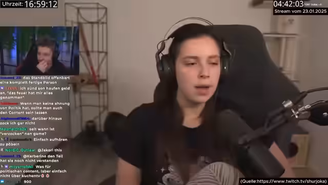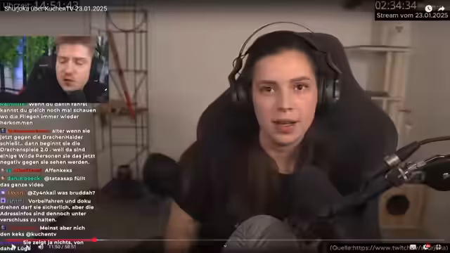 01:01:03Es wird auf Shuyokas Stream vom 23. Januar reagiert, in dem sie wieder über den Streamer gesprochen hat. Es wird festgestellt, dass Shuyoka die Content-Spirale am Laufen halten möchte. Es wird über die Kampagne gegen den Streamer gesprochen und wie diese genutzt wurde, um an einem gesünderen Leben zu arbeiten. Es wird festgestellt, dass Shuyoka ihr Leben umstrukturiert hat, was positiv aufgenommen wird. Es wird jedoch kritisiert, dass sie sich in einer Realität befindet, in der sich alles um Shuyoka dreht. Es wird Shuyoka teilweise zugestimmt, dass es Leute gibt, deren ganzer Tag sich nur um Shuyoka dreht. Es wird kritisiert, dass einige Accounts auch in der Zeit, in der Shuyoka nichts gemacht hat, alte Sachen hochgeladen haben. Es wird festgestellt, dass es krankhaft ist, wenn Leute mehr Zeit mit Shuyoka verbringen als sie selbst. Es wird kritisiert, dass Shuyoka ein Hobby daraus gemacht hat, sich mit Freunden zu treffen, Alkohol zu trinken und über ihre Kunstfigur zu sprechen. Es wird argumentiert, dass dies kein gesundes Verhalten ist. Es wird Shuyoka vorgeworfen, sich mit vielen Leuten Beef gemacht zu haben und dass es Leute aus ihrem Umfeld gibt, die Informationen an den Streamer weitergeben.