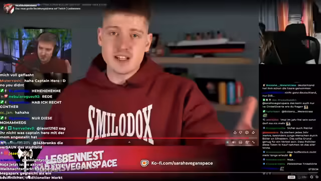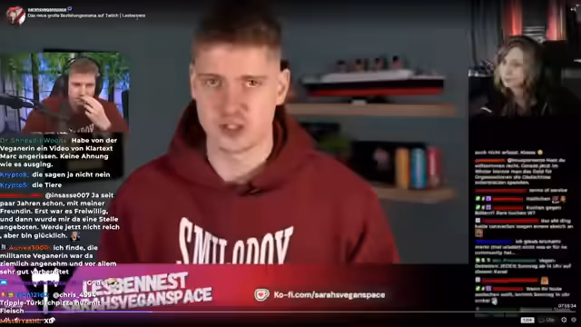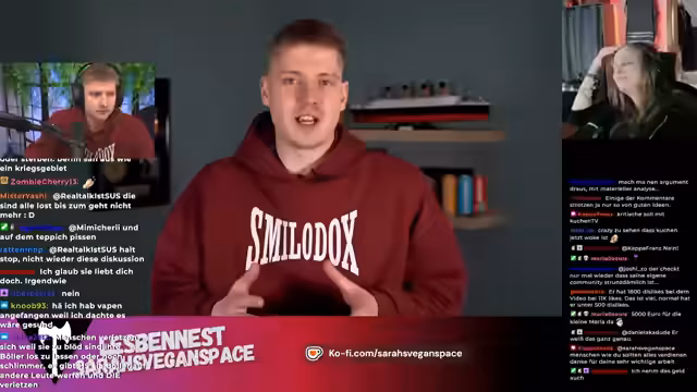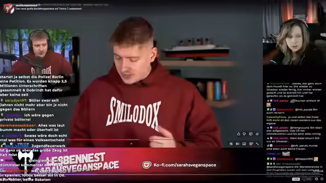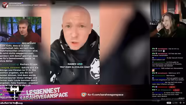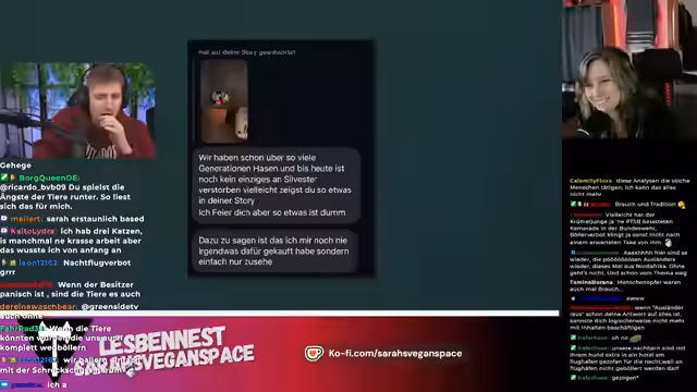 00:01:51Nachdem die technischen Probleme umgangen sind, beginnt die Reaktion auf das Video von SarahsVeganspace. Der Streamer ist überrascht, da sie in ihrem Video sein Böller-Video positiv lobte. Er greift die Thesen des Videos auf, die die negativen Auswirkungen von Feuerwerk auf Tiere und die Umwelt aufzeigen. Er kritisiert die Verteidiger von Böllern und vergleicht deren Argumentationsweise mit der von Fleischessern, die tierleid ignorieren.