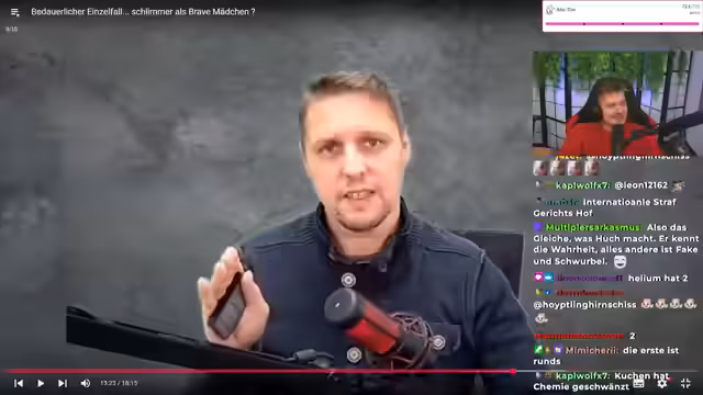 02:00:41Der Streamer reagiert auf einen verschwundenen Podcast des Formats 'bedauerlicher Einzelfall', in dem eine Diskussion mit einem Zuschauer namens Daniel stattfand. Der Fokus liegt auf dem respektlosen und provokativen Verhalten der Moderator Karl gegenüber Daniel. Insbesondere wird eine Aussage kritisiert, in der Daniel aufgefordert wird, seine Mutter ins Bild zu holen, was vom Streamer als gezielte Provokation und Herabwürdigung gewertet wird, um Daniel aus der Ruhe zu bringen und seine Glaubwürdigkeit zu untergraben.
