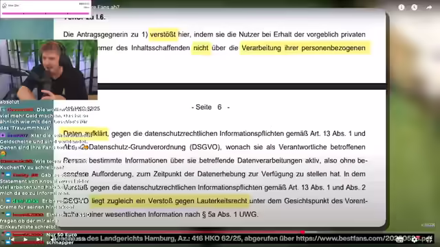 00:29:01Es wird ein Beschluss des Landgerichts Hamburg analysiert, der FanBlast irreführende Praktiken untersagt. Der Streamer betont, dass er kein Jurist ist und die Informationen aus Laiensicht wiedergibt. Der Beschluss wurde auf der Internetseite von Bestfans veröffentlicht, einem Konkurrenzanbieter im Bereich bezahlter Fankontakte, der jedoch betont, dass die Kommunikation ausschließlich durch die Stars selbst erfolgt. Laut einer Pressemitteilung des Kurier Verlags bot FanBlast Content Creatorn die Möglichkeit, mit Partneragenturen zusammenzuarbeiten, die die Kommunikation im Namen der Creator übernahmen und deren Schreibstil imitierten. Dies wird als irreführend kritisiert. Der Streamer vergleicht dies mit Praktiken bei Onlyfans, wo oft Mitarbeiter die Kommunikation übernehmen. Das Gericht untersagt FanBlast, sein Angebot so zu bewerben, dass Kunden denken könnten, sie würden direkt mit dem Content Creator kommunizieren, wenn dies nicht sichergestellt ist. Der Streamer argumentiert, dass ein solches Geschäftsmodell für Creator keinen Sinn ergibt, wenn sie tatsächlich selbst schreiben müssten, da sie mit der Erstellung von Content mehr Geld verdienen könnten. Die einzige Möglichkeit, wie sich das für den Creator lohnt, ist, wenn andere für ihn schreiben. Das Gericht geht davon aus, dass FanBlast einen Dienstleister einsetzt, der für die Stars mit den Fans chattet, was als widerlich bezeichnet wird. Abschließend wird die Frage aufgeworfen, warum ein erfolgreicher Millionär wie Knossi es nötig hat, Fans mit solchen Praktiken abzuziehen.