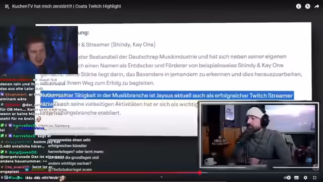 02:24:46Der Streamer kritisiert Jesus dafür, ein 40-minütiges Video über den mangelnden kommerziellen Erfolg des Albums zu erstellen und einen Rap-Workshop für 185 Euro anzubieten. Er hinterfragt, wozu Jesus berechtigt sei, Feedback für Songs zu geben, da er selbst keine nachweisbaren Erfolge habe, weder in der Musik noch auf Twitch oder YouTube. Der Streamer gibt an, dass Jesus mit durchschnittlich 260 Zuschauern auf Twitch nicht als erfolgreich gelten könne.