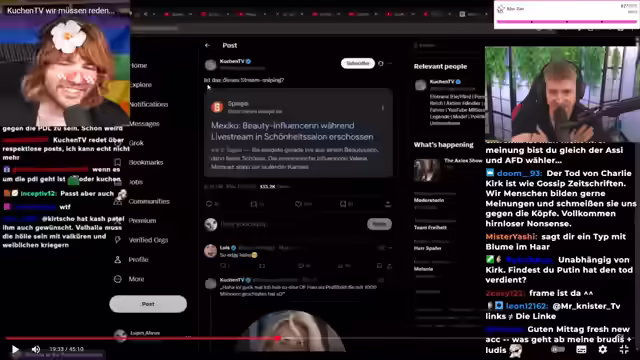 00:34:39Der Streamer diskutiert die Interpretation von Aussagen und die Frage, wie man mit Kritik umgehen sollte. Es wird argumentiert, dass bestimmte Äußerungen, insbesondere nach einem Todesfall, als indirekte Freude interpretiert werden können. Der Streamer kritisiert, dass manche Menschen solche Äußerungen nutzen, um ihre Begeisterung für Gewalt zu zeigen. Es wird auch die Frage aufgeworfen, ob man zu allem seinen Senf dazugeben muss, und der Streamer räumt ein, dass er als Meinungsblogger bekannt dafür ist. Es wird ein Posting von Felix Schulz analysiert, das im Zusammenhang mit dem Attentat in den USA steht, und der Streamer kritisiert, dass der Kontext nicht klar genug dargestellt wurde.