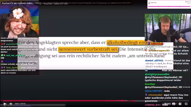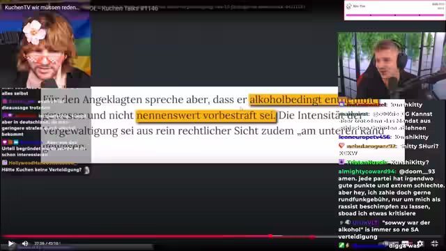 01:36:20Es wird ein Fall diskutiert, in dem eine 15-Jährige vergewaltigt wurde und der Täter lediglich 3.000 Euro Schmerzensgeld zahlen muss, was als unangemessen gering kritisiert wird. Die Diskussionsteilnehmer äußern Unverständnis darüber, dass solche Urteile gefällt werden und fordern härtere Strafen für Vergewaltiger, unabhängig von ihrer Herkunft. Es wird ein weiterer Fall erwähnt, in dem ein Asylbewerber versucht haben soll, eine Reiterin zu vergewaltigen, wobei die Echtheit dieser Meldung jedoch nicht bestätigt werden konnte. Die generelle Straffreiheit für Vergewaltigung in Deutschland wird kritisiert und gefordert, dass Täter lange Haftstrafen erhalten sollten. Es wird argumentiert, dass Vergewaltigung das Leben der Opfer zerstört und daher angemessen bestraft werden muss. Die Schwierigkeit der Beweisführung bei solchen Delikten wird angesprochen, aber auch die Tatsache, dass ein Geständnis strafmildernd wirkt, was kritisiert wird. Es wird der Eindruck erweckt, dass die Herkunft des Täters bei der Urteilsfindung eine Rolle spielen könnte, was jedoch nicht die Intention des Streamers sei. Die Tatsache, dass Alkoholisierung mildernd gewertet wird, wird ebenfalls kritisiert, da dies ein falsches Signal sende.