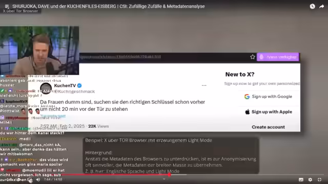 00:19:16Der Streamer äußert sein Unverständnis über die Insolvenz von Sausalitos, da die Filiale in Braunschweig seiner Erfahrung nach immer gut besucht war. Er vergleicht dies mit der Insolvenz von Real, die ebenfalls trotz hoher Kundenfrequenz überraschend kam. Es wird erwähnt, dass die Filiale in Braunschweig vorerst geöffnet bleibt und ein Investor gesucht wird. Der Streamer scherzt darüber, den Laden zu kaufen, obwohl er dort Hausverbot hat. Er kündigt an, sich später BG Katja anzusehen und beginnt nun mit dem heftigen Exposing-Video. Es wird KuchenTV Uncut angekündigt und die Themen Shoyoka, Dave, Kuchenfiles, CSI, zufällige Zufälle und Metadatenanalyse angesprochen. Der Streamer betont, dass alles dokumentiert wurde und er den Überblick über die gesamte Lage hat, da er seit anderthalb Jahren dazu dokumentiert. Er äußert sein Missfallen über den wannabe-journalistischen Stil von Kuchenfiles, der seiner Meinung nach eher amateurhaft wirkt.