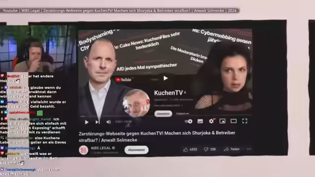 00:24:14Es wird die Kampagne von Shuyoka auf ihrem Discord angesprochen, bei der nach Hilfe für Recherchearbeit gesucht wurde, um Inhalte zu melden und Werbepartner zu kontaktieren. Der Streamer kritisiert das Anschreiben von Werbepartnern und verweist auf den Fall von Holy und Hero Wars, die ihre Partnerschaften beendet haben. Er argumentiert, dass Shuyoka durch diese Aktionen riskiert, dass ihr in Zukunft dasselbe widerfährt, falls sie wieder Placements erhalten sollte. Der Streamer erwähnt den Code-Free-Kuchen für ein Überraschungsgewürz und den Code-Free-Tee-Kuchen für ein Überraschungs-Tee-Set bei Ankerkraut. Er kritisiert die linksextreme Solidarität und vermutet Dave hinter Kuchenfiles. Es wird aufgedeckt, dass Dave bereits vor den ersten Artikeln auf Kuchenfiles das Paulana-Video gesehen hat und dass er in einer Twitter-Diskussion Ähnlichkeiten in der Wortwahl mit Kuchenfiles aufweist. Der Streamer findet es lustig, dass sich niemand mehr für die Seite interessiert und dass die Klickzahlen gering sind. Er zeigt Screenshots von KuchenTV-Tweets, die Dave verbreitet hat, und weist darauf hin, dass Dave die gleichen Bilddateien wie Alerta verwendet hat.