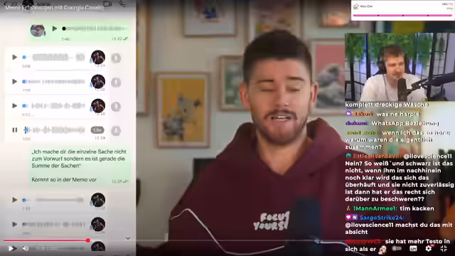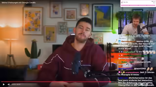 00:21:17Nach einiger Vorbesprechung startet die eigentliche Reaktion auf das Video. Der Streamer stellt vor, dass es um seine Erfahrungen mit der Influencerin Georgia Cavallo geht, mit der er anderthalb Jahre in einer Beziehung war. Das Video, das sie gemeinsam gemacht haben, wird als ein Projekt auf der Plattform Kuchen.de platziert. Er betont, dass das Video im Kontext ihrer Trennung vor dreieinhalb Monaten zu sehen ist und dass es vor allem um das Aufdecken von toxischem Verhalten während der Beziehung gehen soll.