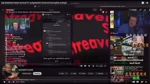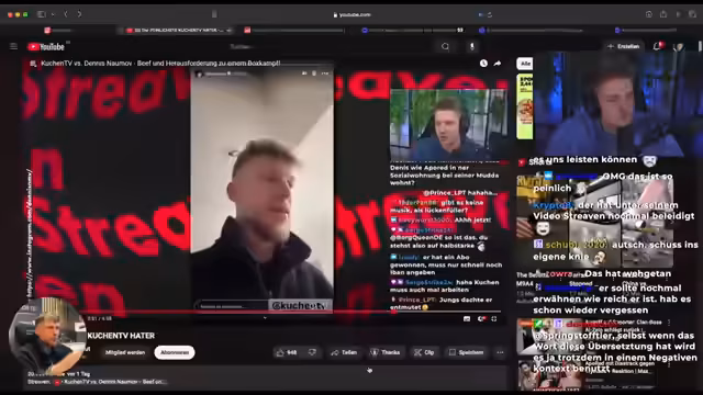 00:02:56Der Stream widmet sich der detaillierten Analyse und Kritik an Dennis Naumov, dem 'dümtesten Kuchentv Hater'. Der Streamer liest diverse private Nachrichten von Naumov vor, in denen dieser seinen Erfolg mit einer Autovermietung, Sportwagen, Luxusuhren und Immobilien betont. Der Streamer unterstellt ihm daraufhin Minderwertigkeitskomplexe und bezeichnet das Verhalten als reine Selbstbeweihräucherung, die nicht motivierend, sondern nur aufdringlich sei. Er wirft Naumov zudem vor, nicht bodenständig aufzutreten und kritisiert dessen öffentliche Äußerungen, insbesondere im Kontext von Vorwürfen häuslicher Gewalt.