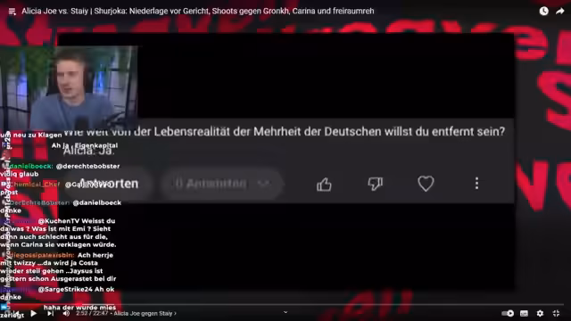 00:07:22Es wird detailliert über den Gerichtsprozess zwischen Shuyoka und Carina Pusch gesprochen. Carina hat eine einstweilige Verfügung erwirkt und den Prozess zu 100 % gewonnen. Shuyoka muss alle Kosten tragen, was einen fünfstelligen Betrag darstellt. Der Streamer betont, dass Shuyoka sich nach der Niederlage ungewöhnlich ruhig verhielt, das Video entfernte und kein Statement abgab. Dies steht im starken Kontrast zu ihren üblichen Reaktionen nach Niederlagen, wo sie sich stets als Opfer darstellte.