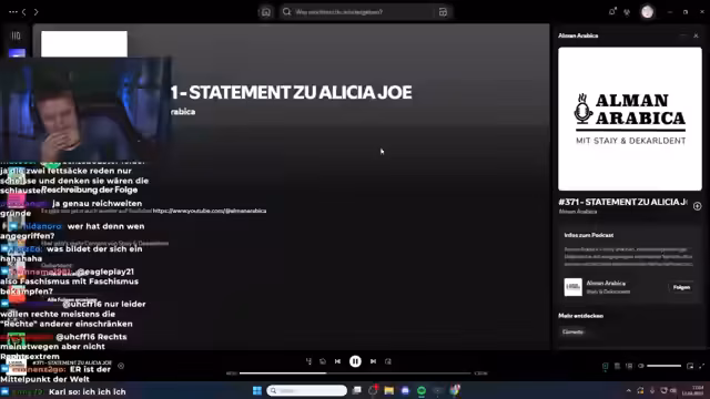 00:50:27Stay äußert, dass er sich keine weiteren Videos von Alicia Joe ansehen wird, obwohl er zugibt, dass sie die Aufmerksamkeit aufgrund seiner Gespräche mit politischen Akteuren nutzen kann. Er bezeichnet es als unsympathisch, dass sie das Video veröffentlicht hat, weil er Reichweite generiert. Stay gesteht jedem seine Meinung zu, muss diese aber nicht korrigieren oder darauf reagieren. Er kündigt an, sich das Robert Habeck Video anzusehen, aber nicht vor Mittwoch. Stay wird als Opfer dargestellt, der zufällig eine Frau fertig macht und sich nicht mehr zu ihr äußern möchte. Er gesteht ein, dass er das Video gesehen, aber nicht verstanden hat. Alicia Joe kritisiert, dass Stay, wenn er schon auf sie reagiert, auch auf Videos reagieren könnte, in denen sie einer Meinung sind, wie z.B. bei Themen zur Stärkung der Demokratie oder Kritik an der Neuen Rechten. Sie bemängelt, dass Stay sich als Aktivist und Weltverbesserer sieht, aber bei wichtigen politischen Themen schweigt und lieber Gossip-Videos macht. Stay hat auf Discord bestätigt, dass es ein Statement geben wird, obwohl er nicht mehr auf Alicia Joe eingehen will.