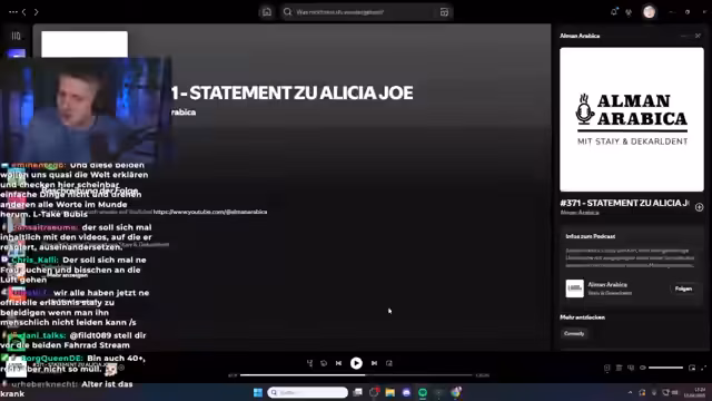 00:33:31Der Stream wechselt das Thema und reagiert auf eine Zusammenfassung von Stays Video, das auf ein Alicia-Jo-Video reagiert. Alicia Jo wirft Stay vor, ihre Aussagen in seinen Reactions absichtlich zu verdrehen und mit beleidigender, überemotionaler Art gezielt Hass gegen sie zu schüren. Der Streamer tegt diese Kritik und sieht in Stay eine der 'unkreativsten Persönlichkeiten' der deutschen Streaming-Szene, die ausschließlich durch Fronting und Aufreger-Mantik eine Reichweime aufbaut.