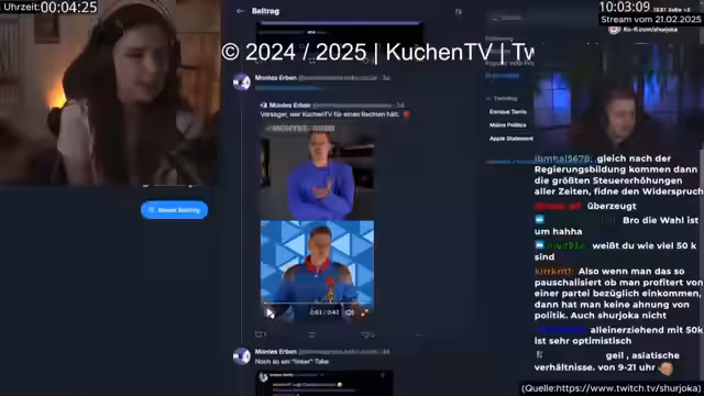 00:01:18Der Streamer äußert sich zur Bundestagswahl und zeigt sich wenig überrascht vom Ausgang. Er spekuliert über eine mögliche große Koalition und bedauert das Abschneiden der FDP, da er nun keine exklusiven Fußbilder veröffentlichen wird. Er kritisiert die hohe Zahl der Linken und argumentiert, dass deren politische Forderungen, insbesondere in Bezug auf Migration und Steuerlast, unrealistisch und schädlich für den Wirtschaftsstandort Deutschland seien. Er verweist auf das Beispiel Norwegen, wo eine Erhöhung der Vermögenssteuer zur Abwanderung von Vermögenden geführt habe. Er verteidigt seine Position gegen Vorwürfe und erklärt, dass er eine Steuer von 75% ab einer Million Euro Einkommen für ungerechtfertigt hält, da dies Investitionen und Unternehmertum in Deutschland unattraktiv mache. Auch wenn er selbst nicht so viel verdient, kann man das kritisieren. Er betont, dass auch Menschen mit geringerem Einkommen von einer Senkung der Mehrwertsteuer profitieren würden, obwohl der Effekt für Besserverdienende größer wäre. Er spricht sich für eine Erhöhung des Steuerfreibetrags und eine Senkung der Mehrwertsteuer auf Grundnahrungsmittel aus.
