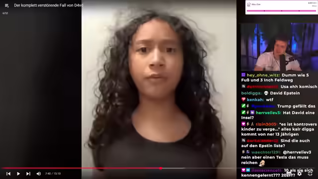 01:47:44Es wird ein TikTok von David erwähnt, in dem er auf einen Kommentar antwortet und nach dem Geburtsdatum von Celeste fragt, was als weiteres Indiz für ihre Beziehung gewertet wird. Ein Twitch-Clip wird gezeigt, in dem David und Celeste zusammen zu sehen sind und der Chat mit Anspielungen auf Epstein und Pädophilie reagiert. Es wird ein TikTok von David erwähnt, das suggeriert, dass er 2021 ein Hello Kitty Girl kennengelernt hat, und es wird darauf hingewiesen, dass Celeste am selben Tag ein ähnliches Foto gepostet hat. Es wird betont, wie unangenehm die Situation ist, da Celeste zu diesem Zeitpunkt erst 13 Jahre alt war und David 19. Es wird spekuliert, dass David seine Liebe zu Celeste nicht offen zeigen wollte, aber dennoch immer wieder kleine Hinweise gegeben hat. Es wird auf Davids Song "Decide" hingewiesen, in dem die Lyrics "Save your tears, seven years" vorkommen, was im Kontext von Celestes Alter (11 Jahre im Jahr 2022) und der Volljährigkeit (18 Jahre) als verstörend interpretiert wird.
