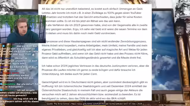 01:16:47Der Streamer merkt an, dass Pia in ihrer Spendenkampagne die Organisation NWO mit Kritik von YouTubern wie Solmecke gleichsetzt, was er als komplett falsch darstellt. Er bemängelt, dass Pia keine Belege für ihre Behauptungen liefert und sie in ihrer Opferrolle bleibt, während sie selbst in mehreren Klagen unterlegen ist. Ihre Kampagne "26 Monate rechtsradikaler Terror im Netz" findet er übertrieben und irreführend.