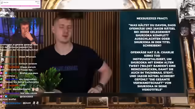 00:39:36Zu Beginn des Abschnitts wird der Umgang von KuchenTV mit dem Thema Shuyoka kritisiert. Es wird argumentiert, dass deren Aussagen, obwohl nicht direkt zu Gewalt aufrufend, in eine problematische Richtung deuten, die Gewalt gegen politische Gegner wie Charlie Kirk rechtfertigt. KuchenTV differenziert dabei zwischen Shuyoka und dem als radikaler geltenden Dave, stellt aber fest, dass sich KuchenTV über den ständigen Umgang mit dem Thema nicht mehr die Zeit nehmen will. Der Streamer betont, dass dies nicht bedeutet, die Aussagen von Shuyoka zu billigen, sondern der ständige Content zu diesem Thema als ausgelaugt empfunden wird.