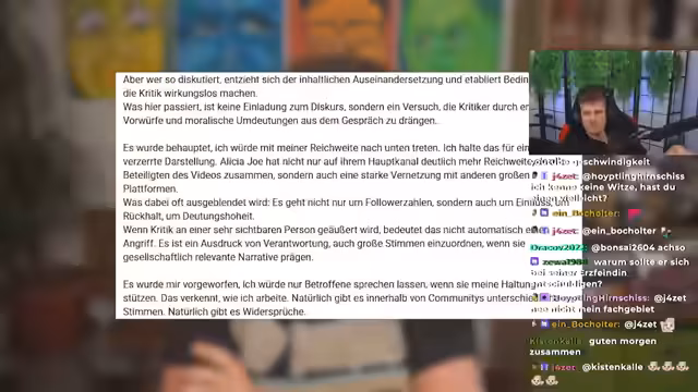 03:17:00Der Streamer zitiert den Satz von Ayoscha, in dem er behauptet, dass in der öffentlichen Diskussion kaum über die eigentlichen problematischen Inhalte gesprochen wurde, sondern nur über ihn selbst. Der Streamer kontert, dass genau dies Ayoschas Verhalten in seinem Statement widerspiegelt, indem er sich selbst in den Mittelpunkt stellt und die Kritik als Framing abtut. Die Behauptung, Alicia Jo habe ein schützendes Netzwerk, wird aufgedeckt, während Ayoscha selbst als privilegiert dargestellt wird, was seine Opfernarrative schwächt.