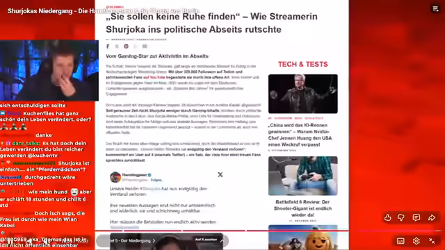 00:11:02Der Streamer kündigt an, ein Shuyoka-Video zu analysieren, da in den letzten Tagen nicht viel Neues von ihr gekommen sei. Er plant, Videos von 'Imp' und 'kurzum' anzusehen, darunter eine Reaktion auf Shuyoka und ein Video über 'Sarah's Vegan Space'. Er geht auf Gerüchte ein, wonach Shuyoka möglicherweise eine Hausdurchsuchung gehabt haben könnte, basierend auf ihren Aussagen über polizeiliche Repressalien und den Erwerb eines Laptops auf Raten, kurz nachdem sie nach Österreich zurückgezogen war, obwohl sie noch keine Wohnung hatte. Er hält eine Hausdurchsuchung für nicht unwahrscheinlich, da Shuyoka in der Vergangenheit antisemitischen und polizeifeindlichen Müll von sich gegeben und Lügen verbreitet habe. Der Streamer betont, dass solche Handlungen Konsequenzen haben müssen und dass der Staat irgendwann eingreifen sollte, wenn Hetze und Falschinformationen verbreitet werden.