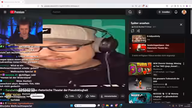 01:36:00Nach der Diskussion über Shuyuka reagiert der Streamer auf ein Video über 'Sarahs Vegan Space', das den Titel 'Das rhetorische Theater der Pseudoklugheit' trägt. Er stellt Sarah als 'Moralpolizei des Internets' dar, die ihre Gesprächspartner mit einer Mischung aus Unverständnis und Beleidigungen bepöbelt, bis diese ihre eigene Existenz als problematisch anerkennen. Ihre 'Superkraft' sei ein einziges Wort – 'Hä?' – das sie als Waffensystem einsetze, um jede logische Diskussion im Keim zu ersticken. Dies wird als 'intellektuelles Gaslighting' bezeichnet, bei dem sie sich dumm stellt, um den anderen als unverständlich oder wirr darzustellen. Der Streamer kritisiert Sarahs rhetorische Strategie, die Diskussionen zu vermeiden, indem sie Verwirrung vortäuscht oder die Relevanz von Argumenten in Frage stellt. Er bemängelt ihre Unfähigkeit, auf Augenhöhe zu diskutieren, und ihre Tendenz, zu dozieren und andere mit mitleidigem Belächeln herabzusetzen. Sarahs Auftreten wird als anstrengend empfunden, selbst von Personen, die inhaltlich zustimmen würden, da sie ihre eigene Befindlichkeit als universelle Moral verkauft und Kritiker als 'schlechte Menschen' darstellt. Sie wird als jemand beschrieben, der nicht argumentieren kann, aber andere als dumm bezeichnen möchte, und der sich selbst widerspricht, indem sie beispielsweise Studien falsch interpretiert oder offensichtliche Fehler von Verbündeten ignoriert.
