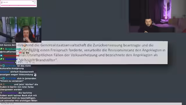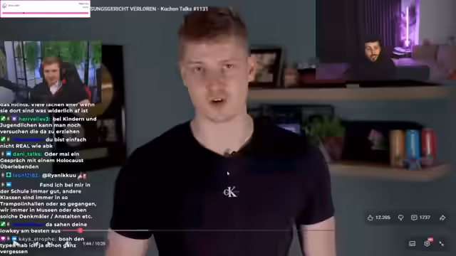 01:25:51Im Jahr 2017 wurde der Streamer wegen Volksverhetzung verurteilt, nachdem er in einem Video über Emilia S. einen antisemitischen Witz aus einer Schul-Chatgruppe kommentiert und als 'gar nicht schlecht' bewertet hatte. Die Mitschüler hatten Nazi-Codes gepostet, worauf Emilia zunächst versuchte, das Problem zu klären, bevor sie die Polizei einschaltete. Der Streamer räumt ein, in dem Video die Schüler beleidigt zu haben, kritisiert aber gleichzeitig die damalige Haltung der Justiz.