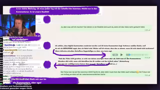 01:57:23Es wird reflektiert, wie der Ersteller eines Entschuldigungsvideos dieselbe Art und Weise der Videoproduktion gegen sich selbst anwendet, die er auch gegen andere nutzt, was als irritierend, aber stabil bewertet wird. Der Streamer gesteht ein, dass es falsch war, was er getan hat. Er erklärt, dass er bei bestimmten Themen, insbesondere dem 'Lehrenfrau-Thema', innerlich enorm getriggert wird und dies zu unüberlegten Aussagen führt, die er selbst nicht vollständig erklären kann. Dieses Thema belastete auch die Freundschaften innerhalb seiner Gruppe, da Lügen über Mitglieder verbreitet wurden. Die Wichtigkeit eines stabilen Freundeskreises wird betont, der in solchen Situationen Halt gibt und Lügen nicht blind glaubt. Die Frustration darüber, dass die Verursacherin solcher Aktionen scheinbar ungeschoren davonkommt, wird als weiterer Triggerpunkt genannt, der zu unüberlegten Reaktionen führt und die Reichweite des Problems durch Berichterstattung anderer noch vergrößert.