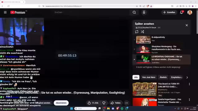 01:35:57KuchenTV kündigt eine detaillierte Auseinandersetzung mit dem Thema „Lehrenfrau Endgame“ an, die sich auf aktuelle Ereignisse konzentriert. Es wird betont, dass es um Erpressung, Manipulation und Gaslighting geht. Die schnelle Reaktion des Erstellers auf die Ereignisse wird hervorgehoben. Es wird angedeutet, dass eine der involvierten Personen sich noch zu Wort melden wird. Die anfängliche Hoffnung, dass sich Lehrenfrau selbst reflektiert hat, wird als enttäuscht dargestellt. Der Ersteller des Videos, Just Nero, hatte ursprünglich ein kürzeres Video geplant, um auf ein dreiminütiges Statement von Lehrenfrau einzugehen. Doch die Situation eskalierte schnell, da das Statement bei genauerer Betrachtung immer wieder neue, manipulative Kleinigkeiten enthielt. Besonders kritisiert wird, dass Lehrenfrau in ihrer Entschuldigung versteckte Botschaften und Vorwürfe einfließen ließ, die ihre Reue in Frage stellen. Es wird die Befürchtung geäußert, dass Lehrenfrau ihren Content auf TikTok fortsetzen wird, aber bei Werbepartnern und auf YouTube keine große Reichweite mehr aufbauen kann, da weiterhin viel über sie berichtet wird. Es wird als problematisch empfunden, dass sie unter einem Entschuldigungsvideo einen Kommentar liked, der den Kritiker als „Red Flag“ bezeichnet, während sie sich gleichzeitig bei ihm entschuldigt. Dies wird als maximal ekelhaft und manipulativ beschrieben. Es wird betont, dass Lehrenfrau nicht einzuschätzen ist und ihre Entschuldigung als unglaubwürdig empfunden wird, da sie weiterhin kritische Kommentare gegen Jay liked und sich nicht wirklich entschuldigt. Es wird enthüllt, dass Lehrenfrau einen Tag vor ihrem Statement mit Jakob und dem Ersteller gesprochen hat, was ihre Lügen noch dreister erscheinen lässt. Just Nero hatte ein dreieinhalbstündiges Video erstellt, um die Situation zu vertiefen und seine Perspektive darzulegen, da er monatelang ge-gaslighted und manipuliert wurde. Es wird die Überzeugung geäußert, dass Lehrenfrau ihre manipulativen Verhaltensweisen fortsetzen wird, da sie sich nur entschuldigt, wenn ihr Ruf geschädigt wird, und nur bedauert, dass ihre Manipulationen aufgeflogen sind. Es wird berichtet, dass Lehrenfrau den Ersteller nach seiner „Mittäterschafts-Aussage“ kontaktiert hat, um die Situation zu klären, was jedoch abgelehnt wurde, da sie nichts eingesehen hat und immer andere die Schuld tragen.