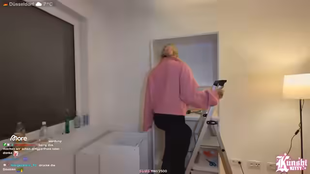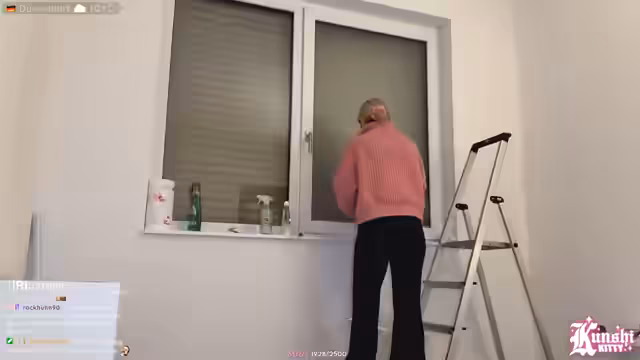 05:57:50Nach Abschluss der ersten Möbel-Konstruktion wechselt die Streamerin zum nächsten Projekt: das Fenster. Sie hat eine Milchglasfolie gekauft, um Privatsphäre zu gewährleisten, stößt aber auf das Problem, dass sie keine Sprühflasche, Schere oder eine geeignete Karte zum Glattstreichen hat. Max ist auf dem Weg zu IKEA, um diese zu besorgen. Während des Schneidens der Folie stellt sie fest, dass diese nicht selbstklebend ist, sondern durch Wasser haftet, was den Prozess kompliziert. Zudem wiederholt sie, warum sie bewusst keine genauen Details zur Wohnung preiszugeben, um ihr Sicherheit zu gewährleisten.