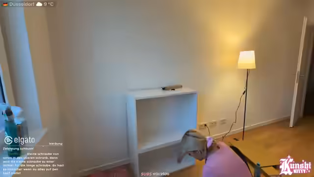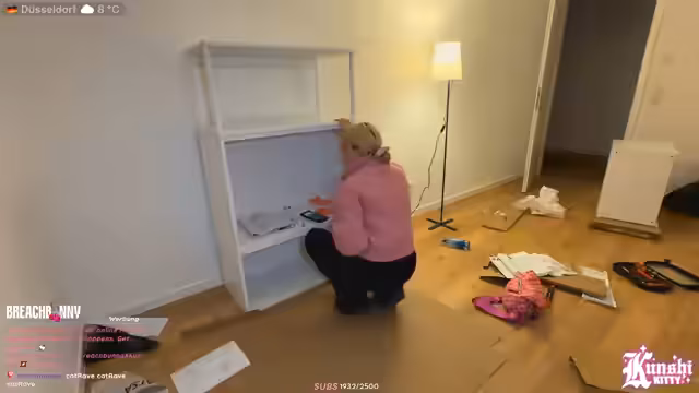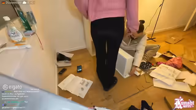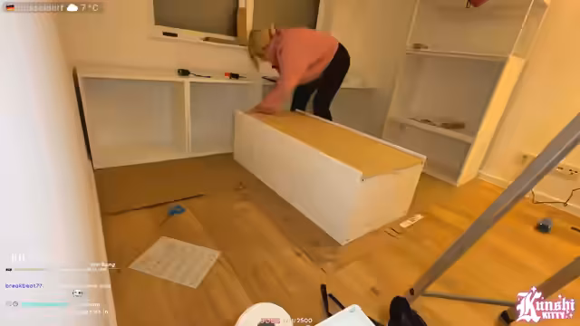 07:29:55Die Streamerin beginnt mit dem Aufbau der neuen Schränke aus IKEA. Ein erster Korpus wird zusammengesetzt, stößt aber auf mehrere Hindernisse. Der Boden ist schmutzig und verursacht Kratzen. Das Zusammenstecken der Schrauben und Teile erweist sich als umständlich und fehleranfällig, weshalb der Akku-Bohrer zu grob ist und manuelle Werkzeuge bevorzugt werden. Der Prozess ist frustrierend und erfordert viel Konzentration.