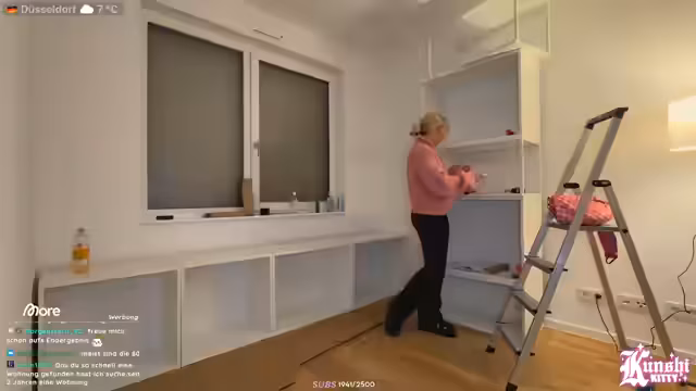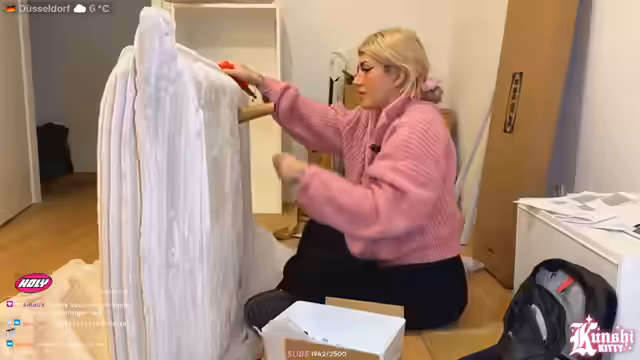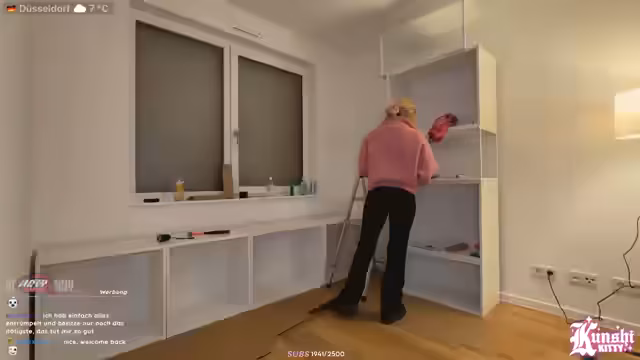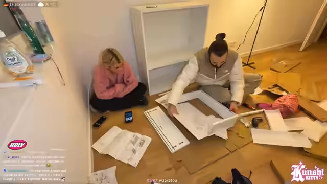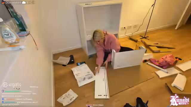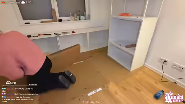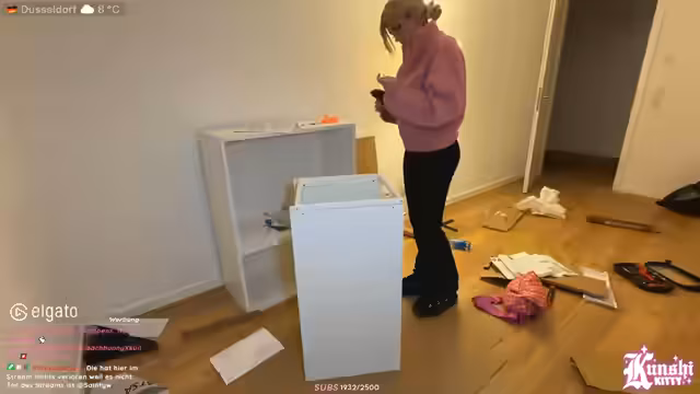 07:23:43Während Max bei IKEA fehlende Teile besorgt, beginnt der Aufbau von Regalen und Schränken. Herausforderungen ergeben sich durch den kalten, unebenen Boden ohne funktionierende Fußbodenheizung, der Kratzer an den Möbeln verursacht. Ohne passende Werkzeuge – wie ein Cuttermesser oder Wasserwaage – verzögert sich der Prozess, und mehrfach fallen Schrauben auf den Boden. Die Montageanleitungen bereiten Verwirrung, insbesondere bei der Verbindung von Korpusen und Schubladen. Geplant ist der Aufbau von Stauraum-Einheiten, die als Hintergrund für Streams dienen sollen. Zeitlich wird der eigentliche Umzug in drei Wochen verortet, wobei die aktuelle Wohnung noch renoviert wird.