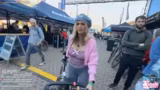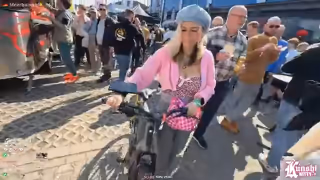 02:41:27Zu Beginn des Streams werden verschiedene Fahrräder und Messestände vorgestellt. Dabei fallen besonders auffällige Modelle wie sehr dicke Sitze, frische Helme und ein spezieller, gefederter Sattel auf. Der Streamer testet mehrere Räder und bewertet sie intensiv. Ein Klapprad fällt durch sein geringes Gewicht auf, wird aber als instabil und unkomfortabel empfunden, insbesondere bei der Federung und beim Lenkverhalten. Gleichzeitig wird das Design und die Handhabung eines schweren, motorisierten Bikes besprochen, das wie ein 'halbes Moped' wirkt.