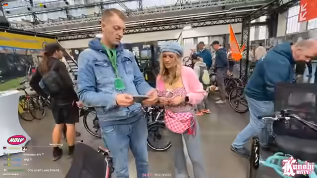 01:40:02Die Messe 'Cycling Europe' wird als Netzwerk- und Neuheitenmesse beschrieben. Der Streamer sucht nach einem Touren-Bike, das für Gelände und Schotter geeignet ist und Gepäck transportieren kann. Er bewegt sich durch die Messe, bestaunt viele verschiedene Fahrräder wie z.B. kollapsbare Räder, Räder mit sehr kleinen Rädern, extrem leichte Titanräder und Dreiräder. Manchmal ist es sehr voll und es ist schwierig die Fahrräder genau zu betrachten.