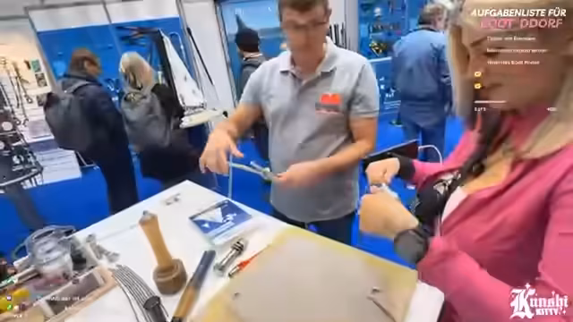 03:02:37Auf der Suche nach einem Stand, an dem sie einen Seemannsknoten lernen kann, wird die Streamerin fündig. Mit der Hilfe eines Experten kann sie den Achterknoten meistern, der laut Aussage ein universeller und wichtiger Knoten für alle Arten von Booten ist. Parallel dazu spricht sie über die technischen Herausforderungen beim Livestreaming, insbesondere die Gefahr einer Überhitzung des Handys, auch wenn sie ein zweites als Backup bereit hält.