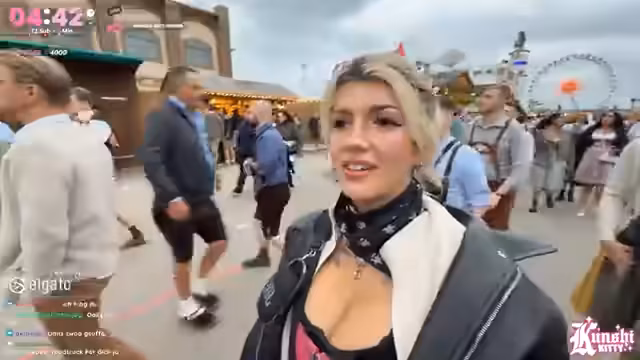 07:24:28Nach den Achterbahnfahrungen plant die Streamerin, noch eine Geisterbahn zu besuchen, für die sie keine Brusthalterung benötigt. Sie stellt ihre Ausrüstung neu ein und nutzt die Gelegenheit, die Nase zu putzen. Anschließend will sie sich mit ihrem Kameramann und einem Freund namens Olli im Löwenbräu-Zelt treffen, um etwas zu essen und zu trinken. Sie beobachtet die Menschenmengen und stellt fest, dass es bald voller werden wird.