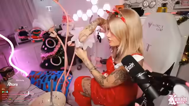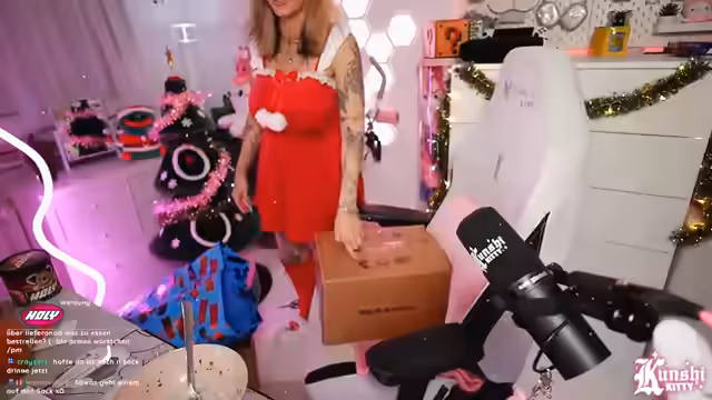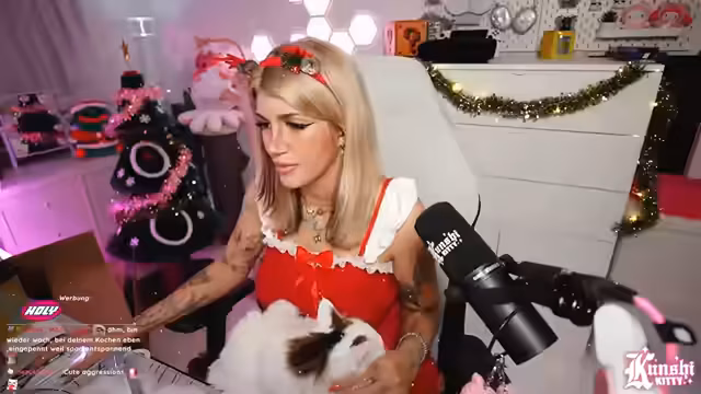 01:42:33Der Streamer beginnt mit dem Aufbau eines neuen rosafarbenen Weihnachtsbaums (Fake-Baum), wird aber durch die neugierigen Katzen (Juni/Jona) massiv gestört. Die Katzen springen auf Teile des Baums, zerren an Verpackungen und verhindern den Fortschritt. Mit Geduld und Hilfestellung des Chats wird der Baum trotz Katzen-Chaos aufgebaut. Es wird diskutiert, ob eine Lichterkette sicher für Katzen angebracht werden kann.