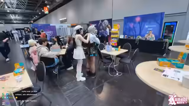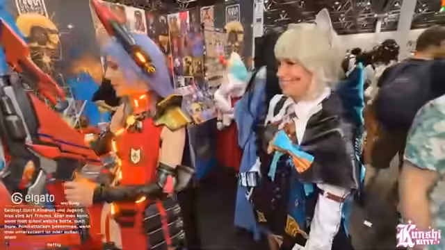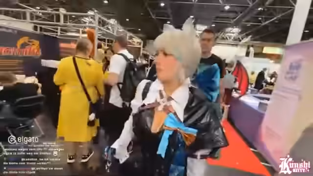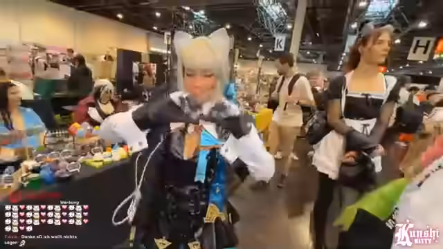 09:41:54Während der weiteren Erkundung der Messehallen werden verschiedene Cosplays und Stände vorgestellt. Ein besonderes Augenmerk liegt auf detailreichen und technisch aufwendigen Kostümen, wie z.B. einem mit LEDs ausgestatteten Outfit. Die Streamerin stellt zudem Überlegungen an, wie professionelle Cosplayer mit eigenen Tätowierungen umgehen, ob sie diese für die Rolle abdecken oder sie als Teil des Charakters integrieren. Die Atmosphäre in den Hallen wird als relativ leer im Vergleich zum Vortag beschrieben.